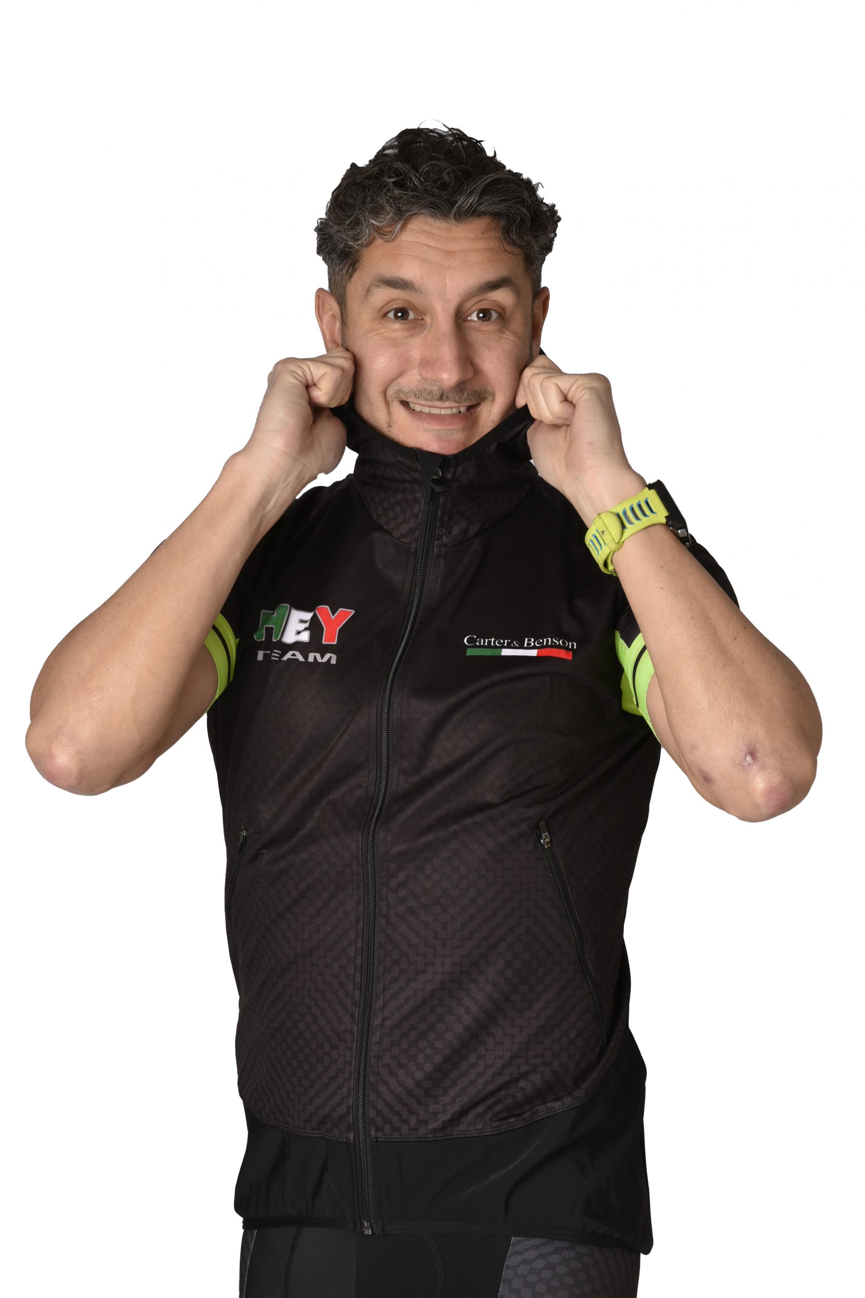 Gilet leggero per attività outdoor, antivento, con cappuccio, zip frontale con protezione mento, e due tasche con chiusura zip.